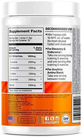 1 تا 2 بار در روز ، 11/6 گرم از بی سی ای ای + آمینو USN را در 300 میلی‌لیتر آب‌میوه یا آب حل کرده و میل کنید .