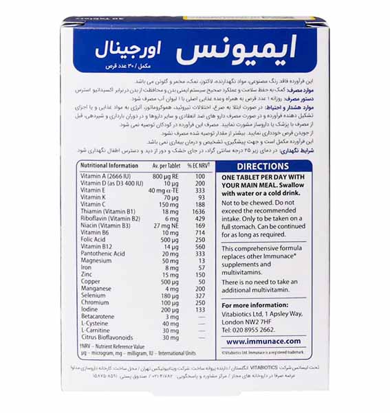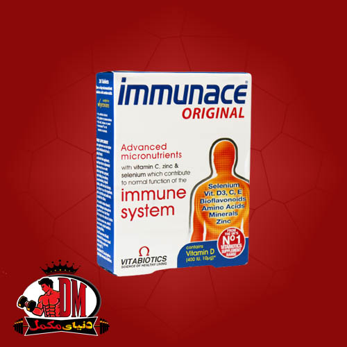 قرص ایمیونیس ویتابیوتیکس ۳۰ عددی (Vitabiotics Immunace) حاوی بیوفلاونوئیدها، بتاکاروتن، ال سیستین، ال کارنتین، ویتامینهای D۳,E,C و مواد معدنی است. همچنین دارای فرمولی کامل و کافی از آنتی اکسیدان ها و ریزمغذیهای ضروری جهت حفظ و تامین سلامت سیستم ایمنی بدن میباشد. این دارو مناسب قبل و بعد از جراحی، بیماریهای مزمن مثل دیابت، بیماریهای قلبی و عروقی، جهت جلوگیری از ابتلا به عفونتها، تامین سلامت بافت بینایی، بهبود مشکلات پوستی بسیار مفید و موثر است و مطالعات بالینی انجام شده در مورد این محصول این مطالب را تایید میکنند.