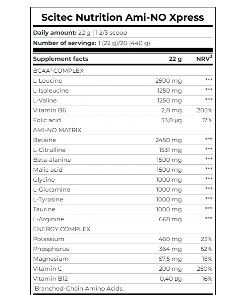 پودر آمینو اکسپرس سایتک نوتریشن ۴۴۰ گرمی (Scitec Amino Xpress) زود جذب و پکیج کاملی از اسید آمینههای ضروری و مورد نیاز بدن است. این محصول همچنین حاوی مقادیر قابل توجهی از منیزیوم، پتاسیم و ویتامینهای ث، ب ۶، ب ۹ و ب ۱۲ و سایر ترکیبات مؤثر در هر سروینگ خود بوده که با سرعت بالا به تأمین آمینو اسیدهای بدن، عضلهسازی بیشتر و همچنین به تعویق انداختن خستگی و بالا رفتن استقامت تمرین و ریکاوری عضلات کمک میکند.