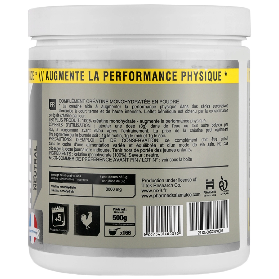 کراتین مونوهیدرات ام ایکس تری تحت لیسانس کشور فرانسه حاوی ۱۰۰ درصد مونوهیدرات میکرونیز شده است.کراتین مونوهیدرات 500 گرمی ام ایکس تری برای افرادی که به ورزشهای قدرتی مانند بدنسازی، وزنه برداری یا ورزشهای مختلف قدرتی مشغول هستند، مناسب است. این مکمل برای افزایش قدرت عضلات، بهبود خونرسانی و افزایش حجم عضلات مورد استفاده قرار میگیرد.